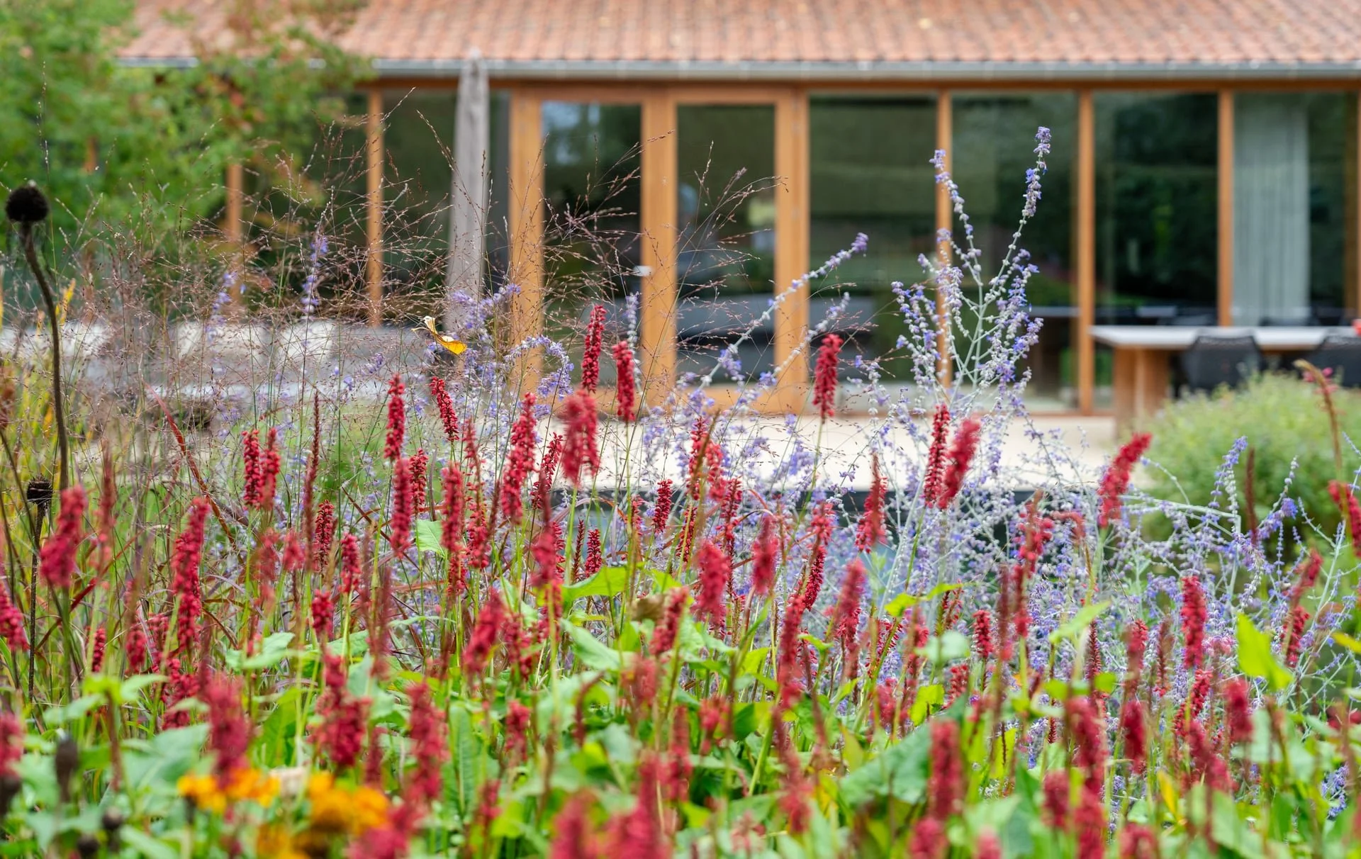 Een structuurontwerp van een landelijke tuin bij een strakke nieuwbouwwoning,