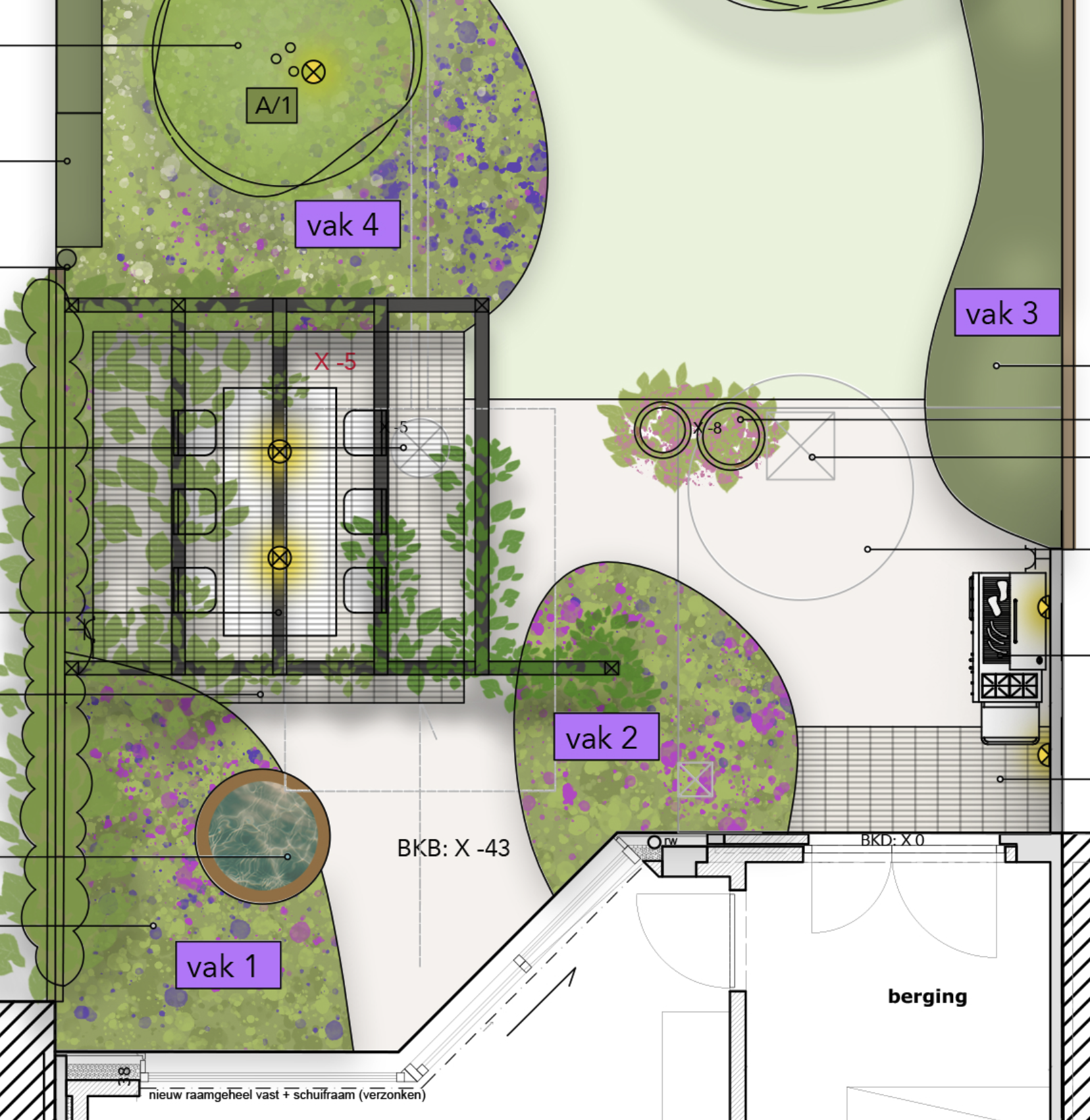 Vernieuwing van een stadstuin tot een eigentijdse buitenruimte met een wadi, pergola, speelelementen