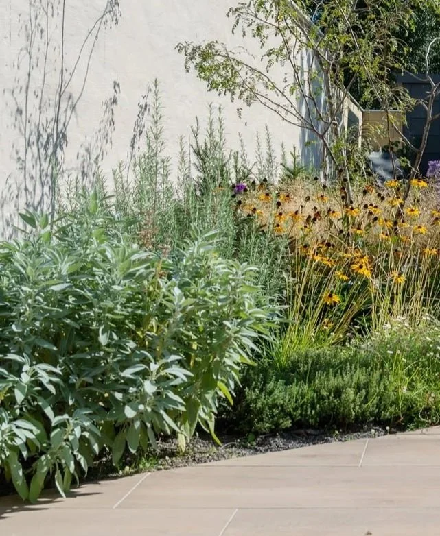 De nieuwe tuinmuren werden hier en daar bekleed met een duurzaam rooster dat na verloop van tijd volledig zal begroeien met klimplanten en zo een thuis zal bieden aan nuttige insecten en vogels.