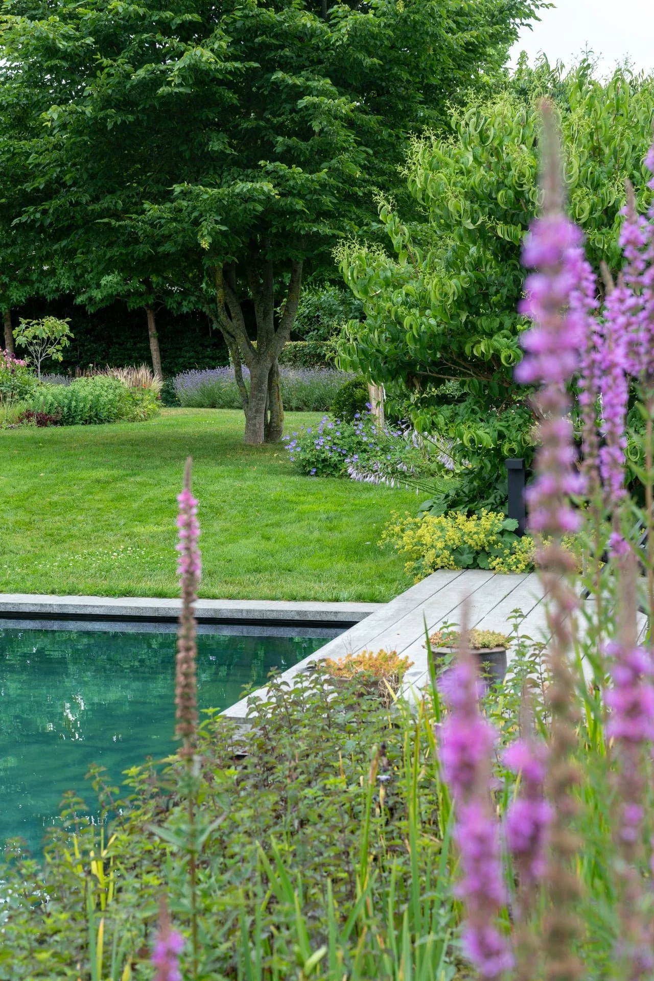 Bij dit project staat een grote meerstammige haagbeuk centraal, die niet alleen een prachtig silhouet vormt, maar ook de nodige privacy garandeert. De natuurlijke zwemvijver nodigt uit tot verkoeling, terwijl de kinderen zich uitleven op het voetbalveldje of een boek lezen in de hangmat – een echte familietuin dus.